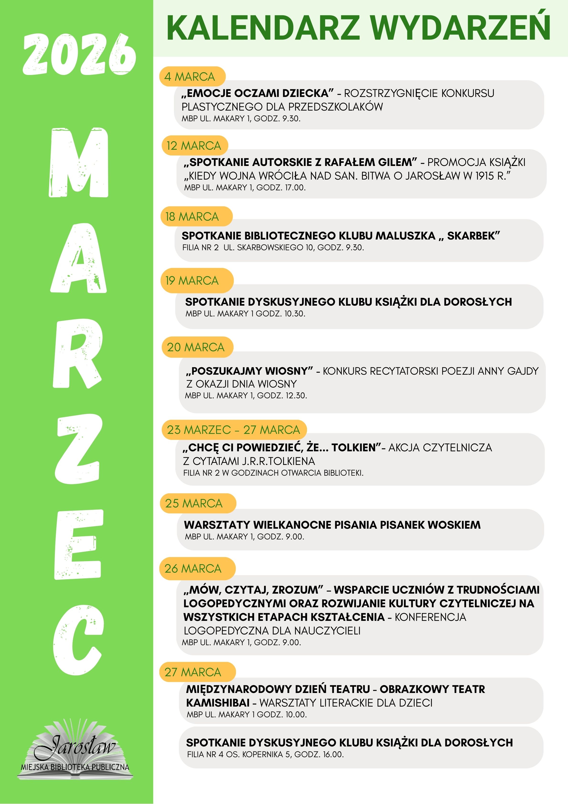 Zapraszamy wszystkich czytelników oraz użytkowników biblioteki do zapoznania się z aktualną ofertą wydarzeń kulturalnych. Szczegółowe informacje dotyczące spotkań, warsztatów i atrakcji dostępne są w kalendarzu wydarzeń na naszej stronie internetowej