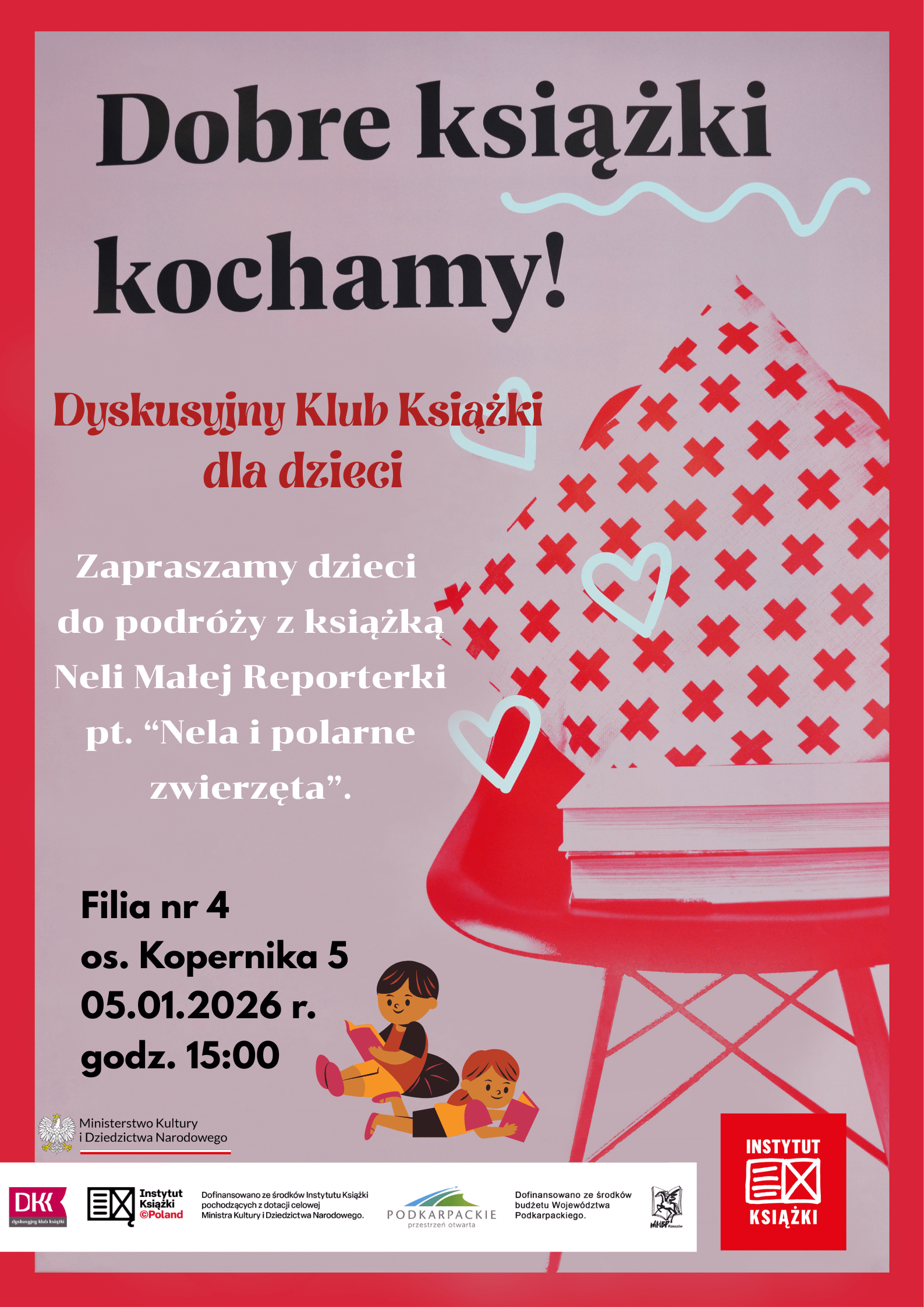 Zapraszamy dzieci w wieku 9 – 14 lat na pierwsze w tym roku spotkanie Dyskusyjnego Klubu Książki dla Dzieci. Tematem spotkania będzie książka Neli Małej Reporterki pt. „Nela i polarne zwierzęta”. Spotkanie odbędzie się w dniu 5 stycznia br. ( poniedziałek) o godz. 15:00 w Filii nr 4 na osiedlu Kopernika 5. Zapraszamy! Wstęp wolny!