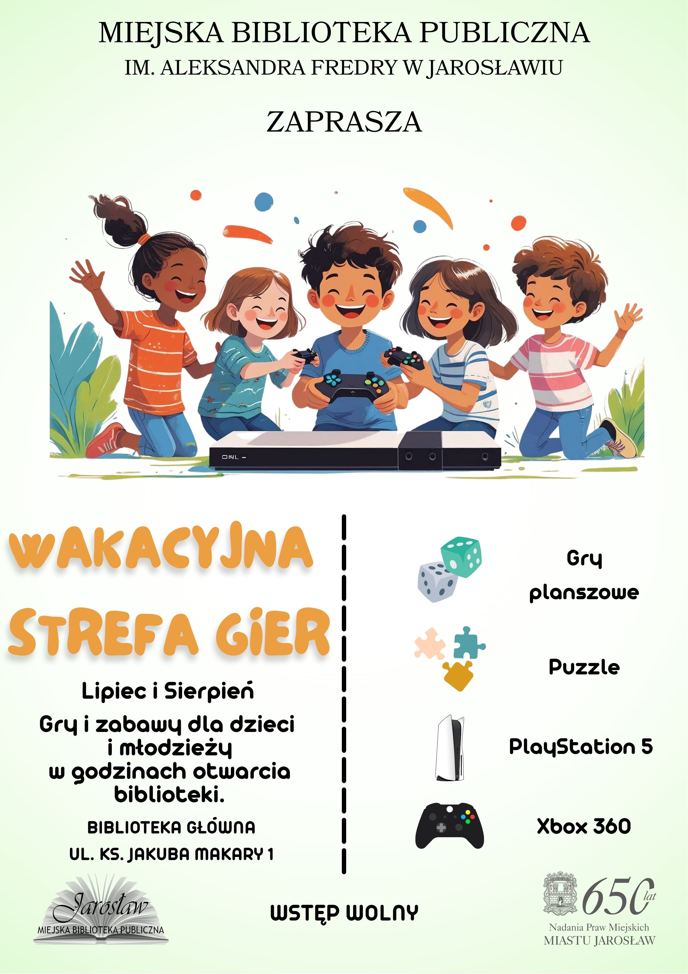 Zapraszamy dzieci wraz z rodzicami i młodzież do Wakacyjnej Strefy Gier w bibliotece. Uczestnicy będą mogli skorzystać z gier planszowych, puzzli, Xboxa i konsoli PlayStation 5 na miejscu lub wypożyczyć do domu. Strefa Gier będzie czynna podczas wakacji w lipcu i sierpniu w godzinach otwarcia biblioteki.