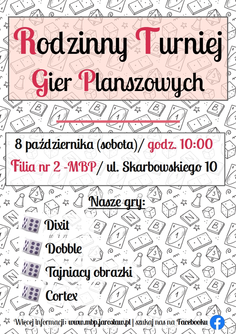 8 października o godz. 10:00 zapraszamy pary (dorosły + dziecko w wieku 8-12 lat) do próby swoich sił w turnieju gier planszowych. Uczestnicy zmierzą się w eliminacjach z grami „Dobble” oraz „Tajniacy: obrazki”, a następnie z grą „Cortex: wyzwania” oraz w finale z „Dixit”.