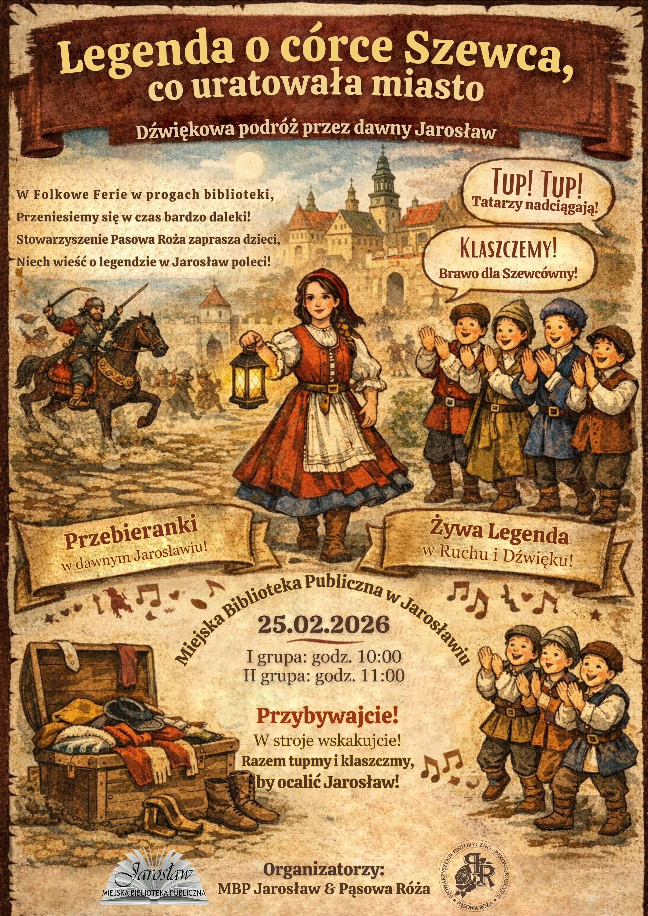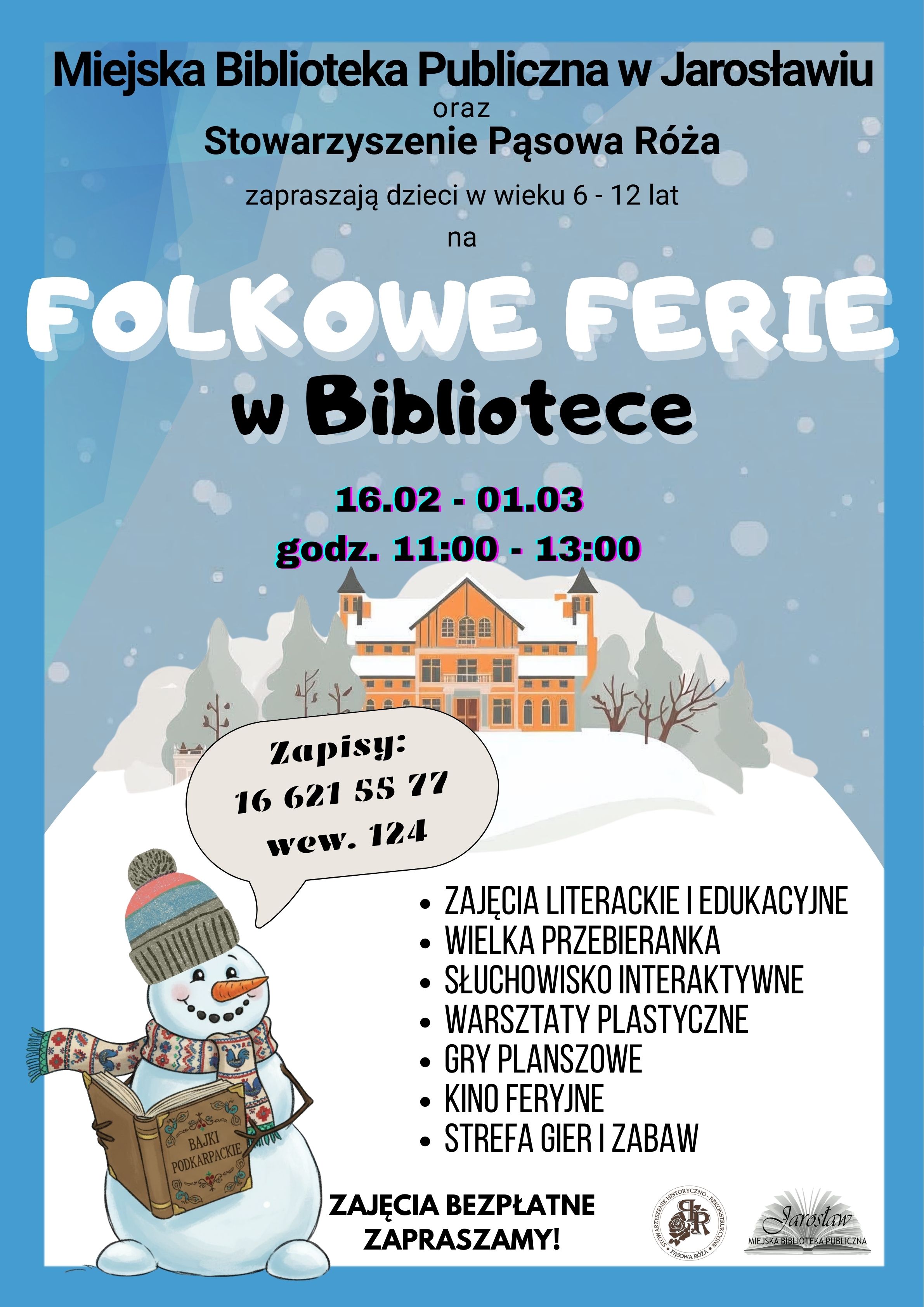 Miejska Biblioteka Publiczna im. Aleksandra Fredry w Jarosławiu oraz Stowarzyszenie „Pąsowa Róża zapraszają dzieci w wieku 6-12 lat do udziału w zajęciach warsztatowych pod hasłem „Folkowe Ferie w bibliotece” w dniach 16.02. – 27.02 2026 r. Podczas warsztatów dzieci poznają historię i legendy Jarosławia, różne ciekawostki a także regionalne tradycje i zwyczaje. Zajęcia łączą głośne czytanie bajek, muzykę, zabawę oraz warsztaty edukacyjne i plastyczne.