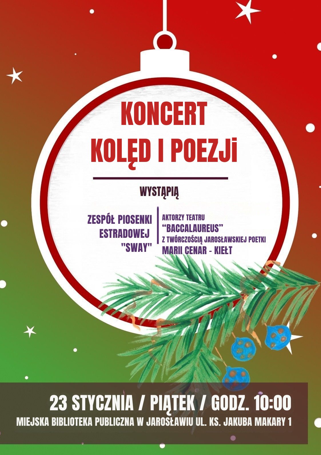 Miejska Biblioteka Publiczna im. Aleksandra Fredry w Jarosławiu zaprasza na Koncert Kolęd i Poezji 2026 w wykonaniu Zespołu Piosenki Estradowej „Sway” oraz prezentację poezji jarosławskiej poetki Marii Cenar-Kiełt w interpretacji aktorów Teatru „Baccalaureus” z Centrum Kultury i Promocji w Jarosławiu. Spotkanie odbędzie się 23 stycznia (piątek) o godz. 10.00 w Miejskiej Bibliotece Publicznej w Jarosławiu, ul. Makary 1. Wstęp wolny.