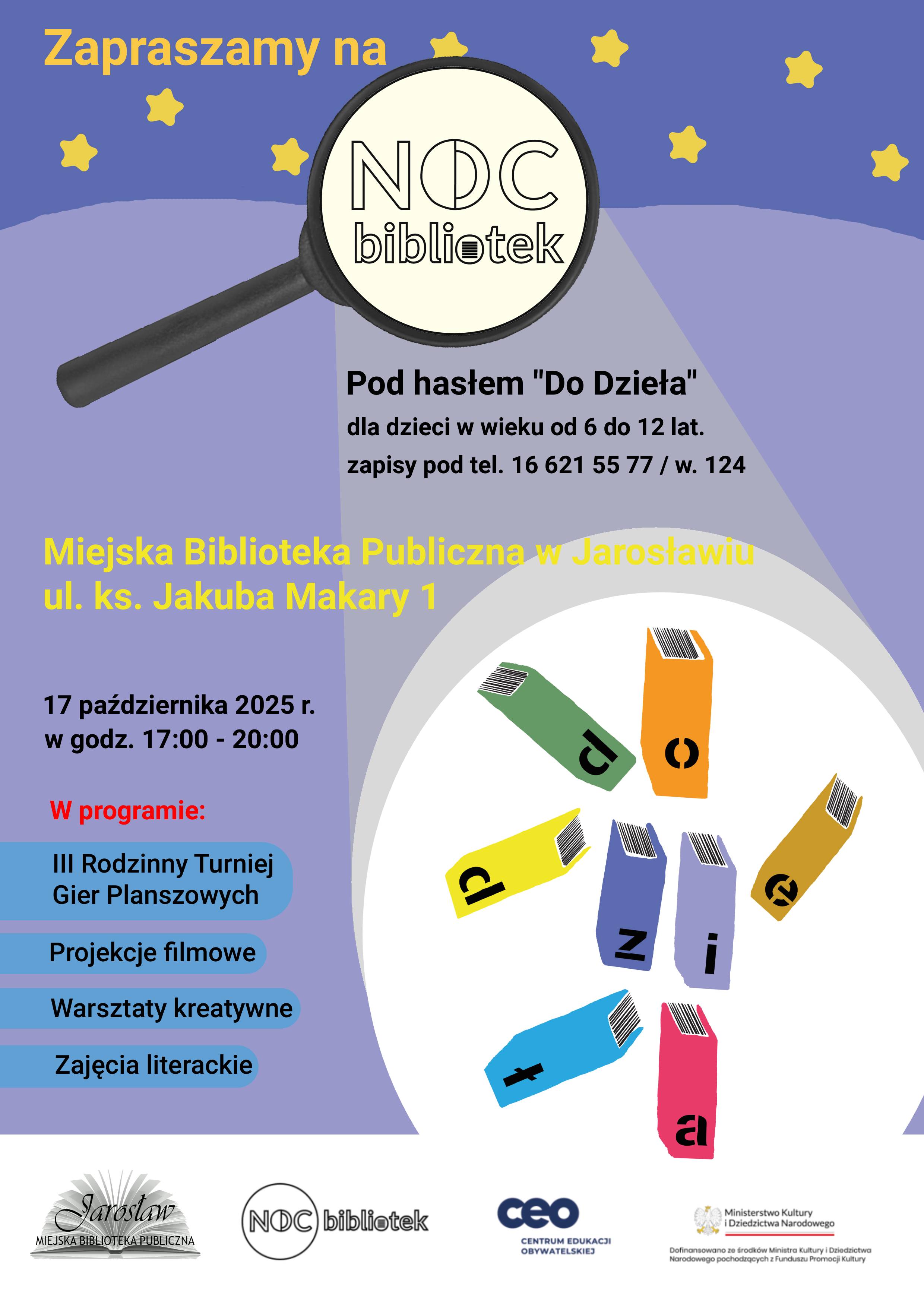Noc Bibliotek to ogólnopolska akcja promująca czytanie i biblioteki jako wyjątkowe miejsce do spotkań z kulturą i bogatą ofertą dla lokalnej społeczności. Obecna XI edycja akcji Nocy Bibliotek odbywa się pod hasłem DO DZIEŁA! Na wydarzenie obowiązują zapisy pod numerem telefonu 16 621 55 77 w. 124.