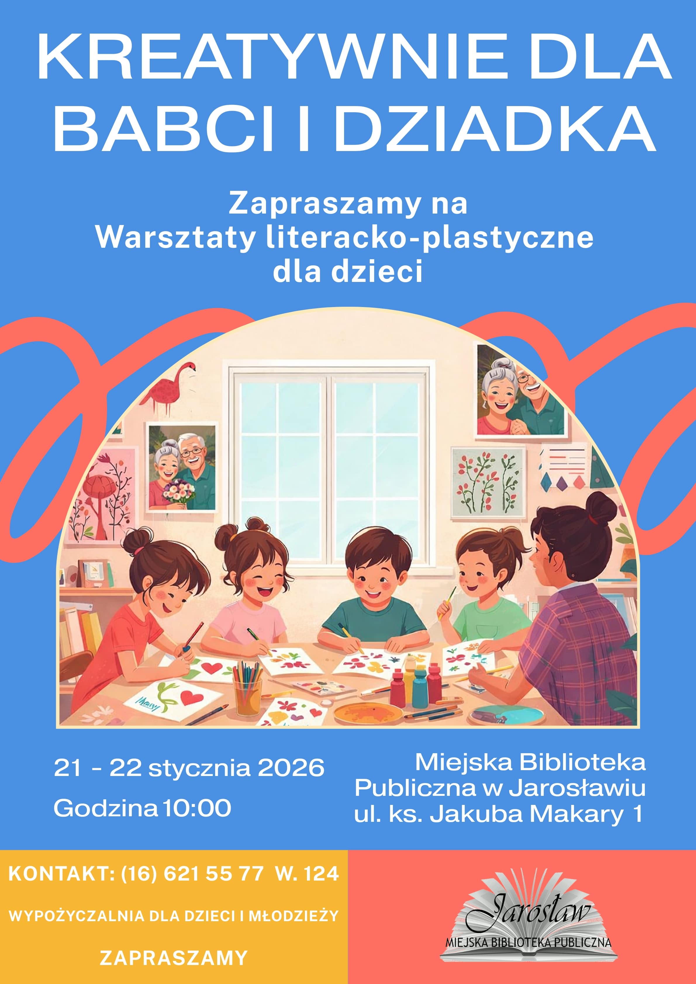 Miejska Biblioteka Publiczna im. Aleksandra Fredry w Jarosławiu zaprasza dzieci na warsztaty literacko-plastyczne pod hasłem „Kreatywnie dla Babci i Dziadka”, które odbędą się 21 – 22 stycznia o godz. 10.00 w siedzibie biblioteki ul. Ks. Makary 1. Zapraszamy!