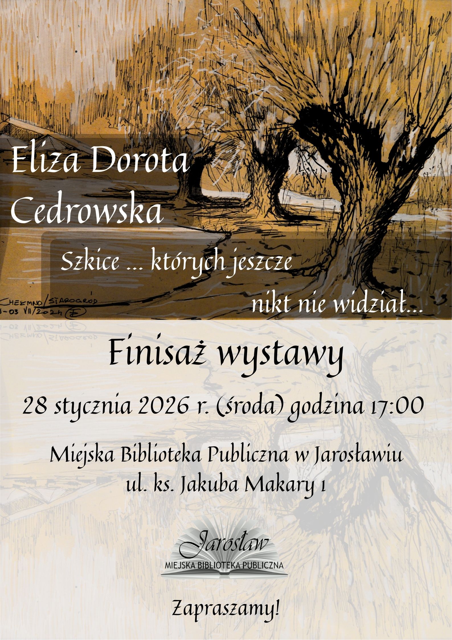 Zapraszamy na Finisaż wystawy Elizy Doroty Cedrowskiej pt. „Szkice … których jeszcze nikt nie widział…”, który odbędzie się w dniu 28 stycznia (środa) o godz. 17:00 w Galerii Miejskiej Biblioteki Publicznej w Jarosławiu ul. ks. Jakuba Makary 1. Zapraszamy!