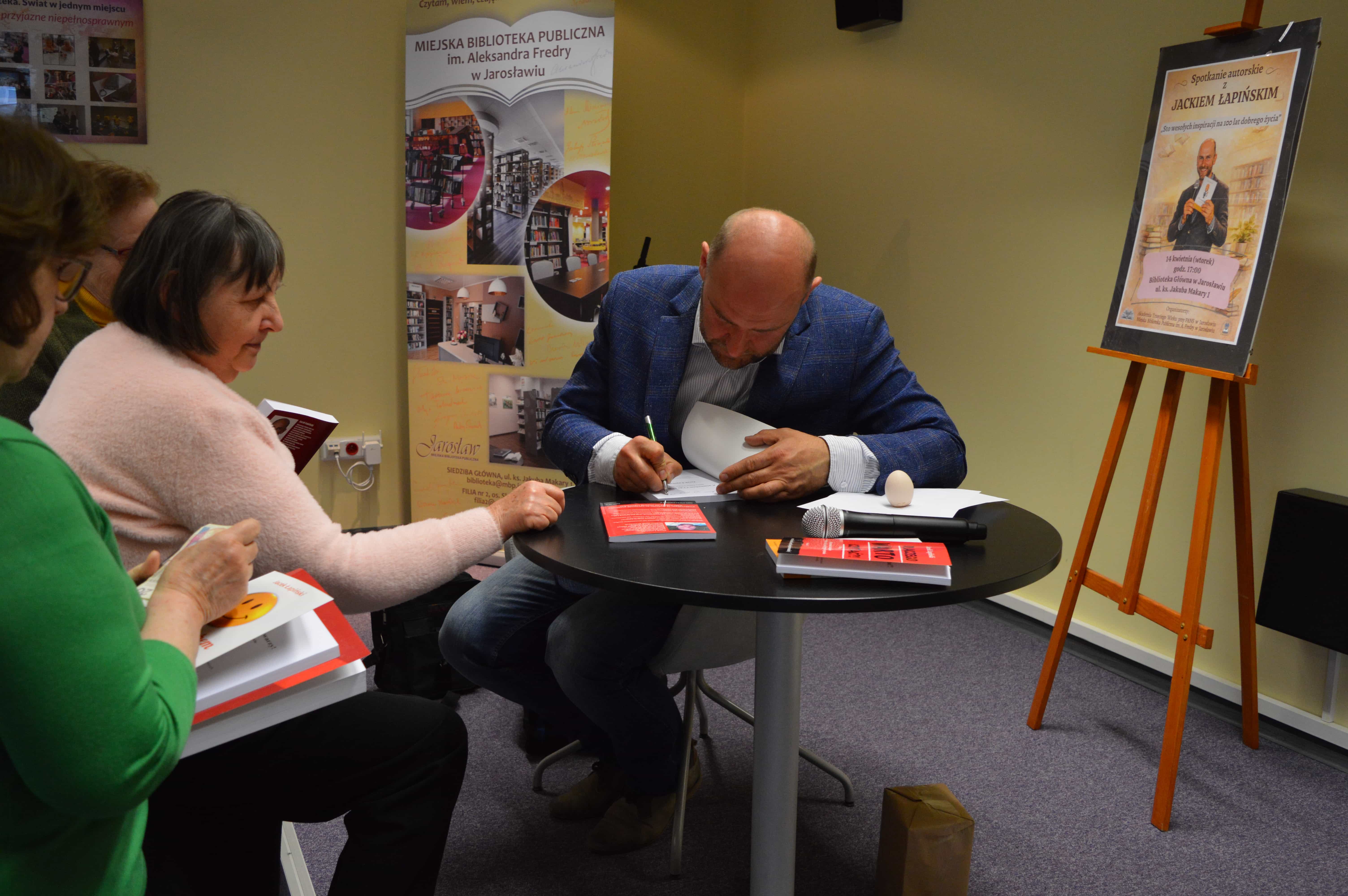 14 kwietnia, w ramach wykładów Akademii Trzeciego Wieku, gościliśmy w naszej bibliotece Jacka Łapińskiego – autora książek, promotora czytelnictwa oraz pasjonata rozwoju osobistego. Z wykształcenia prawnik, z zamiłowania edukator, który zaraża optymizmem, energią i entuzjazmem wobec życia. Podczas spotkania autor opowiadał o swojej pracy twórczej i literackiej, a także poruszał tematy dobrostanu, samopoczucia oraz marzeń. Nie zabrakło dobrego humoru, ale również refleksji – o wartościach, codziennych wyborach oraz znaczeniu pozytywnego myślenia. Podzielił się swoimi doświadczeniami związanymi z pisaniem i czytaniem, pokazując, że literatura może być nie tylko źródłem wiedzy, lecz także motywacji i radości. W swoich książkach – takich jak „Z uśmiechem Ci do twarzy” czy „Jak być lepszym” – przekonuje, że zmiana zaczyna się od drobnych rzeczy, a uśmiech, życzliwość i pasja potrafią naprawdę wiele zdziałać.