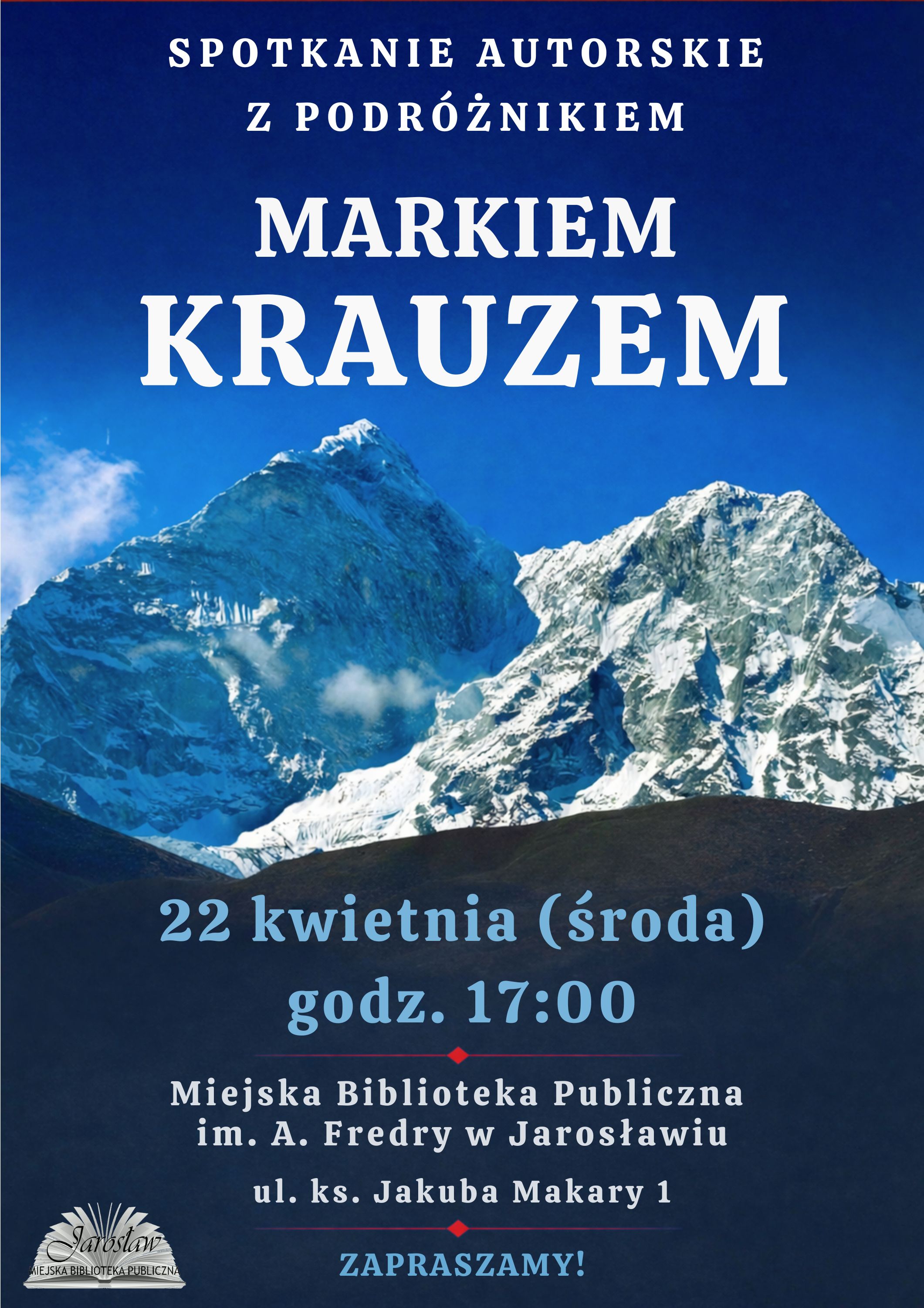 Miejska Biblioteka Publiczna im. Aleksandra Fredry w Jarosławiu oraz Wydawnictwo Edytorial zapraszają na spotkanie autorskie z podróżnikiem Markiem Krauzem, autorem książki o wyprawie w Himalaje pt: „Sześć tysięcy metrów prawdy… dziennik z krainy chmur i kamienia…”, które odbędzie się 22 kwietnia (środa) o godz. 17.00, Biblioteka Główna, ul. Ks. Makary 1.