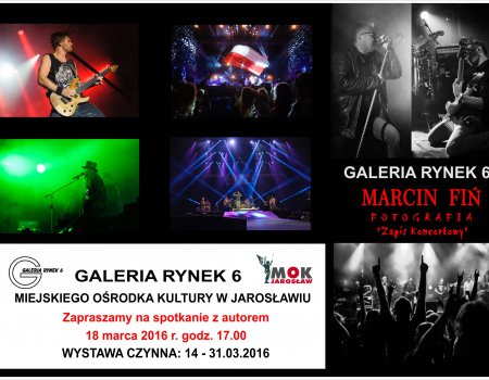 Od 14 marca br. do końca miesiąca w galerii RYNEK 6 będzie można oglądać fotografie, na których uwiecznione zostały momenty z koncertów muzycznych. Taki też jest i tytuł wystawy "Zapis koncertowy". Autorem zdjęć jest utalentowany, młody artysta z Przemyśla – Marcin Fiń, który debiutował wystawą w Przemyślu w Centrum Kulturalnym. Serdecznie zapraszamy na spotkanie z autorem 18 marca 2016 roku o godz. 17.00 w Galerii RYNEK 6 Miejskiego Ośrodka Kultury w Jarosławiu.