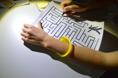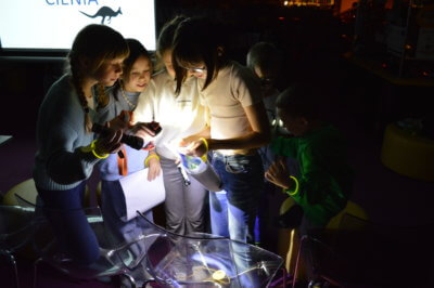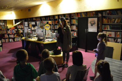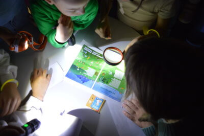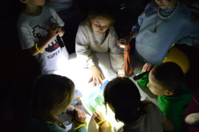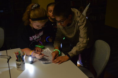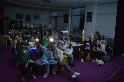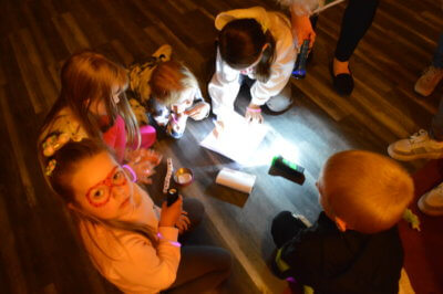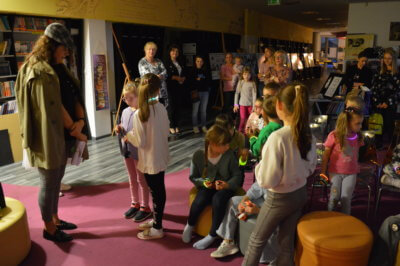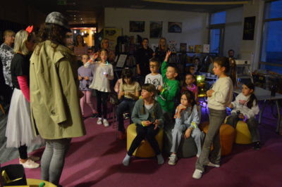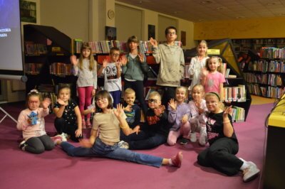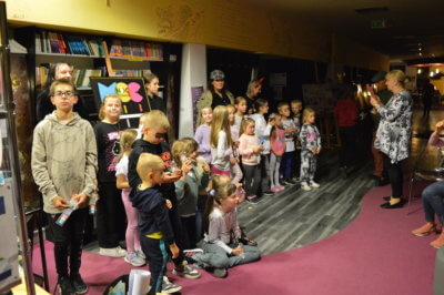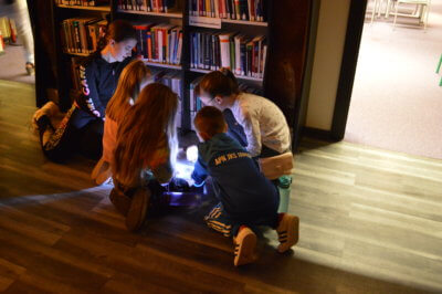 W ramach gry MOCno tajemnicza BIBLIOTEKa mali detektywi uzbrojeni w latarki poszukiwali w całym budynku zadań i wskazówek, które miały stworzyć hasło oddające ducha wieczoru. Dzieci rozwiązywały literackie krzyżówki i szarady, tworzyły własne opowieści z Story Cubes, sprawdziliśmy także ich znajomość działów biblioteki.