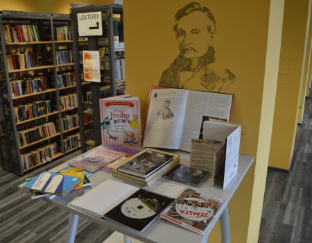 Zachęcamy do wypożyczania utworów Aleksandra Fredry, które prezentujemy na zamieszczonych zdjęciach, na których obejrzeć można również grafiki z cytatami i fragmenty biografii pisarza.
