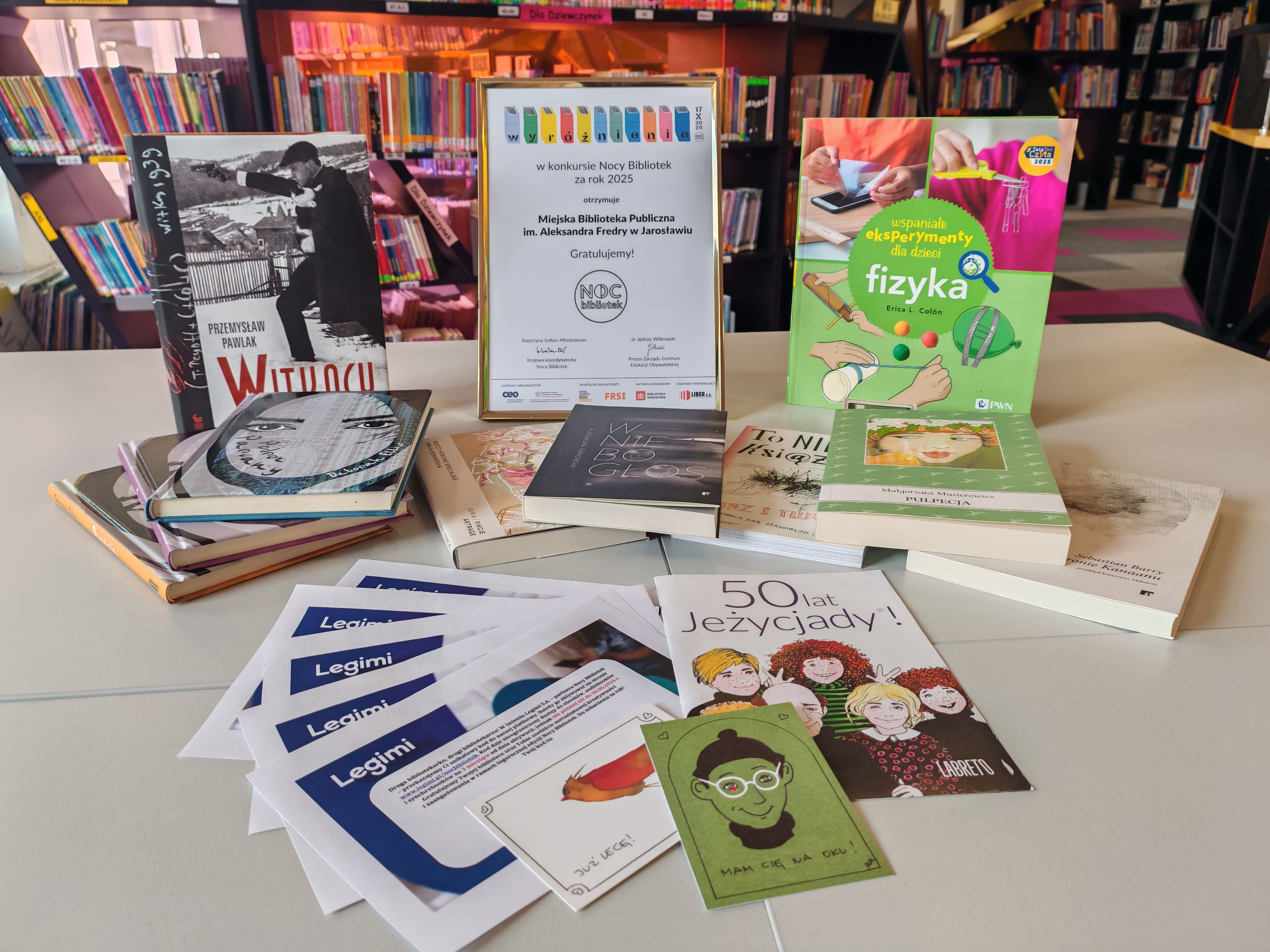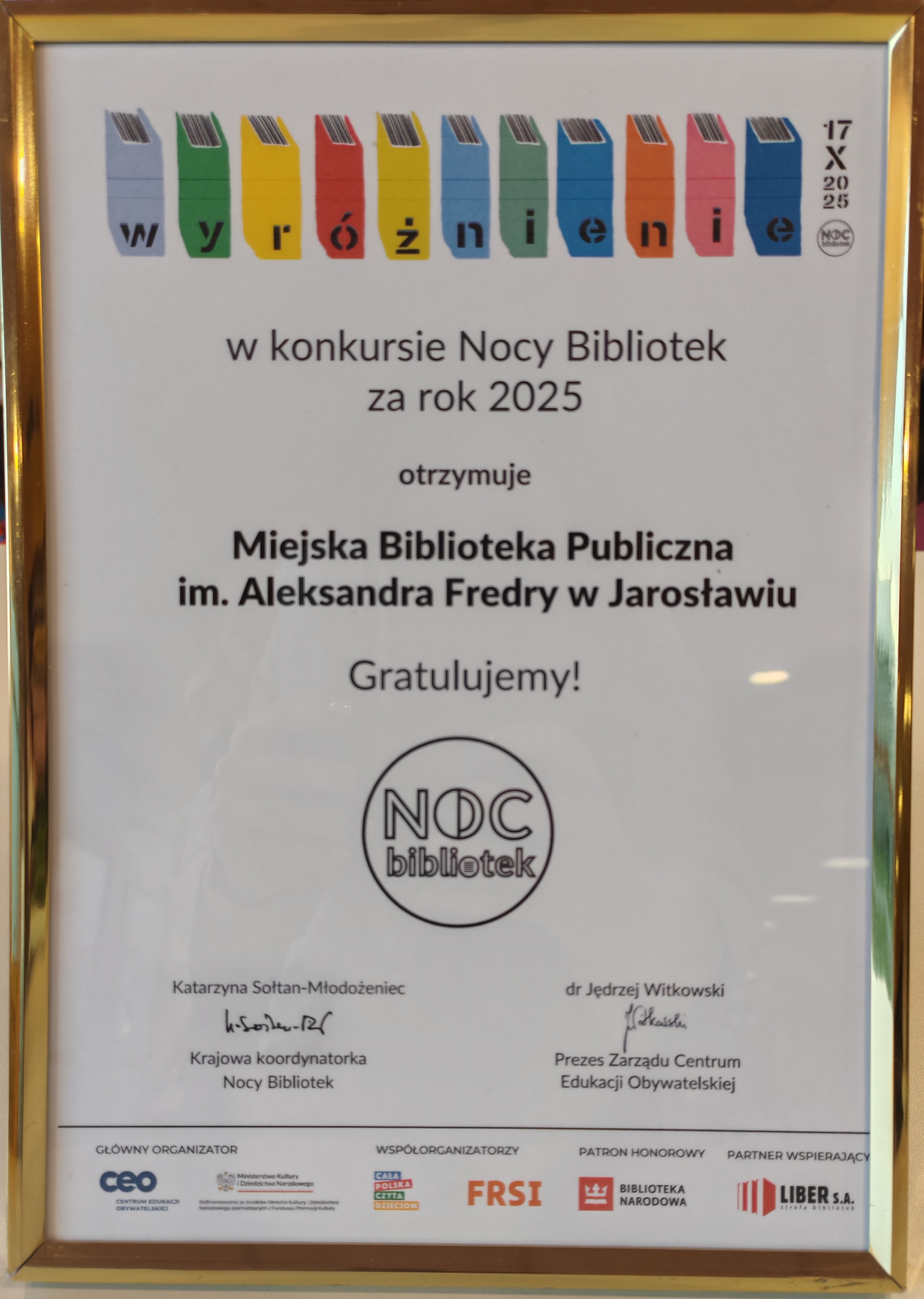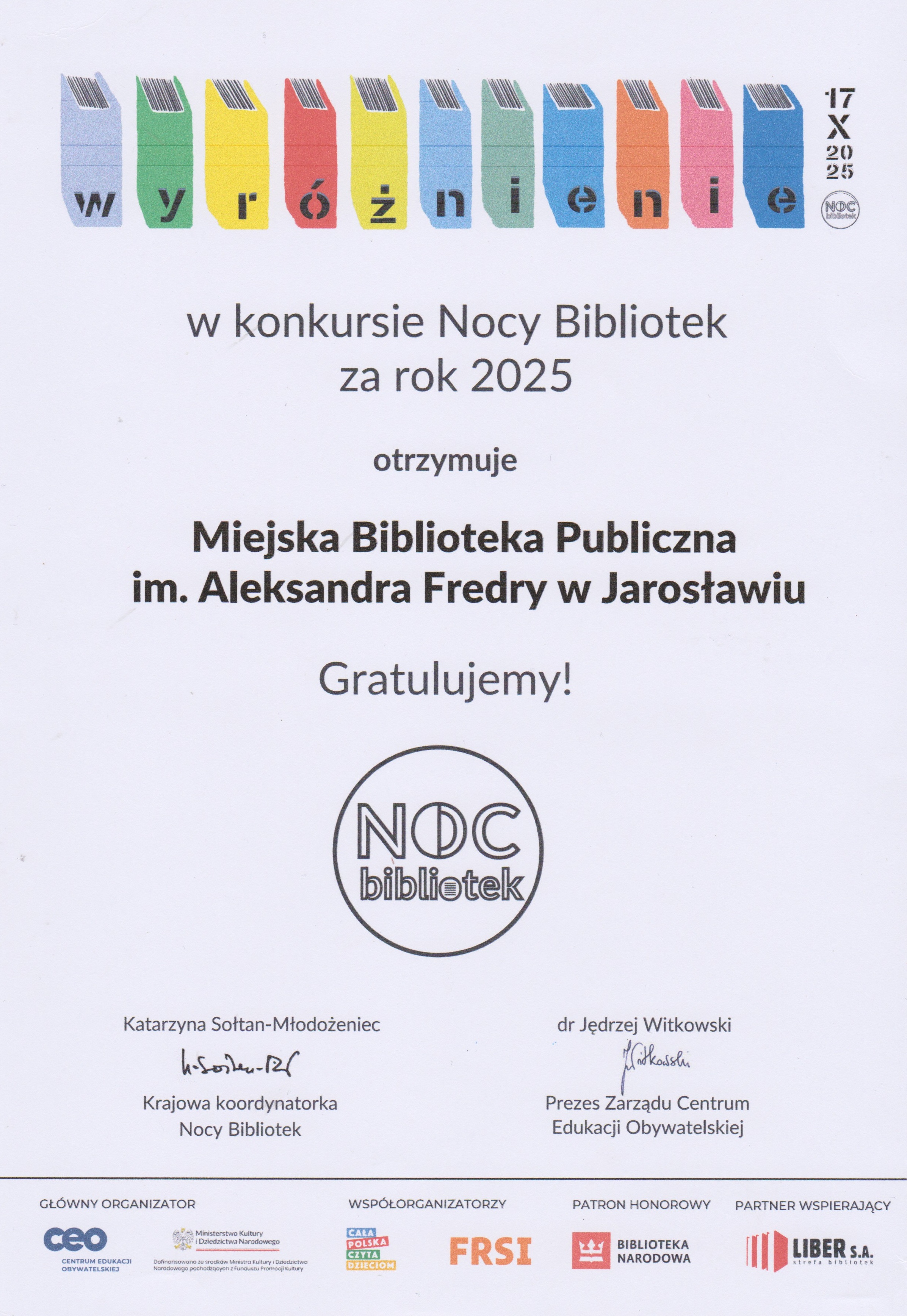 Z radością informujemy, że jarosławska Biblioteka została wyróżniona w ogólnopolskim konkursie Nocy Bibliotek 2025 na najciekawsze i wyróżniające się wydarzenia tegorocznej akcji pod hasłem Do dzieła! Spośród 1642 Bibliotek w kraju biorących udział w tegorocznej akcji Jury wyróżniło naszą Bibliotekę, podkreślając wielkie zaangażowanie i kreatywność oraz trudność wyboru spośród setek wyjątkowych Nocy Bibliotek. Nagrody w postaci paczek z książkami, kodami i gadżetami literackimi rozesłano do wszystkich laureatów konkursu, za co bardzo dziękujemy! Głównym organizatorem projektu Noc Bibliotek jest Centrum Edukacji Obywatelskiej w Warszawie a projekt sfinansowano ze środków Ministerstwa Kultury i Dziedzictwa Narodowego pochodzących z Funduszu Promocji Kultury.