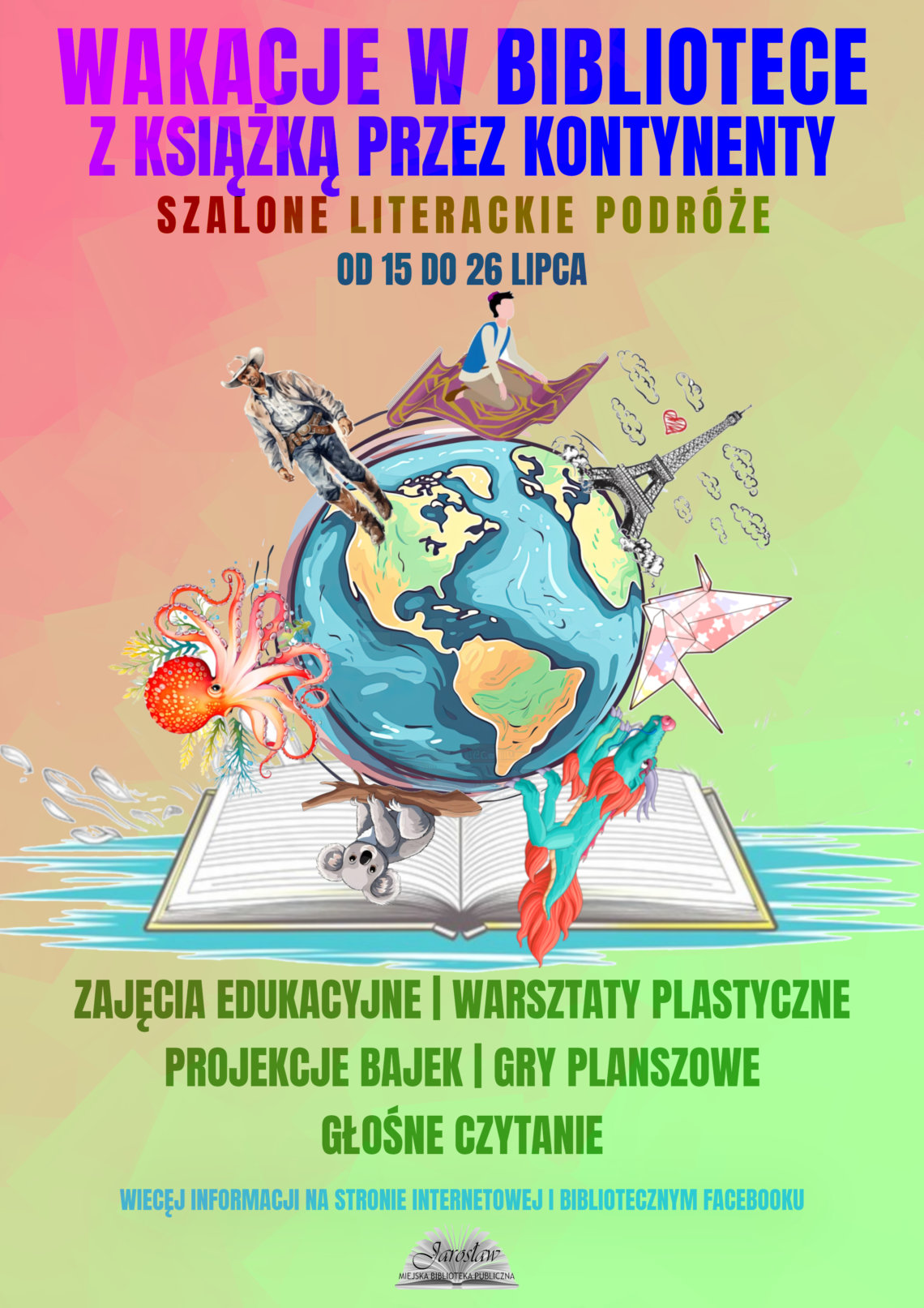 Od 15 do 26 lipca zapraszamy najmłodszych czytelników na wakacje w bibliotece. W tym roku lato spędzamy pod hasłem „Z książką przez kontynenty -szalone literackie podróże.