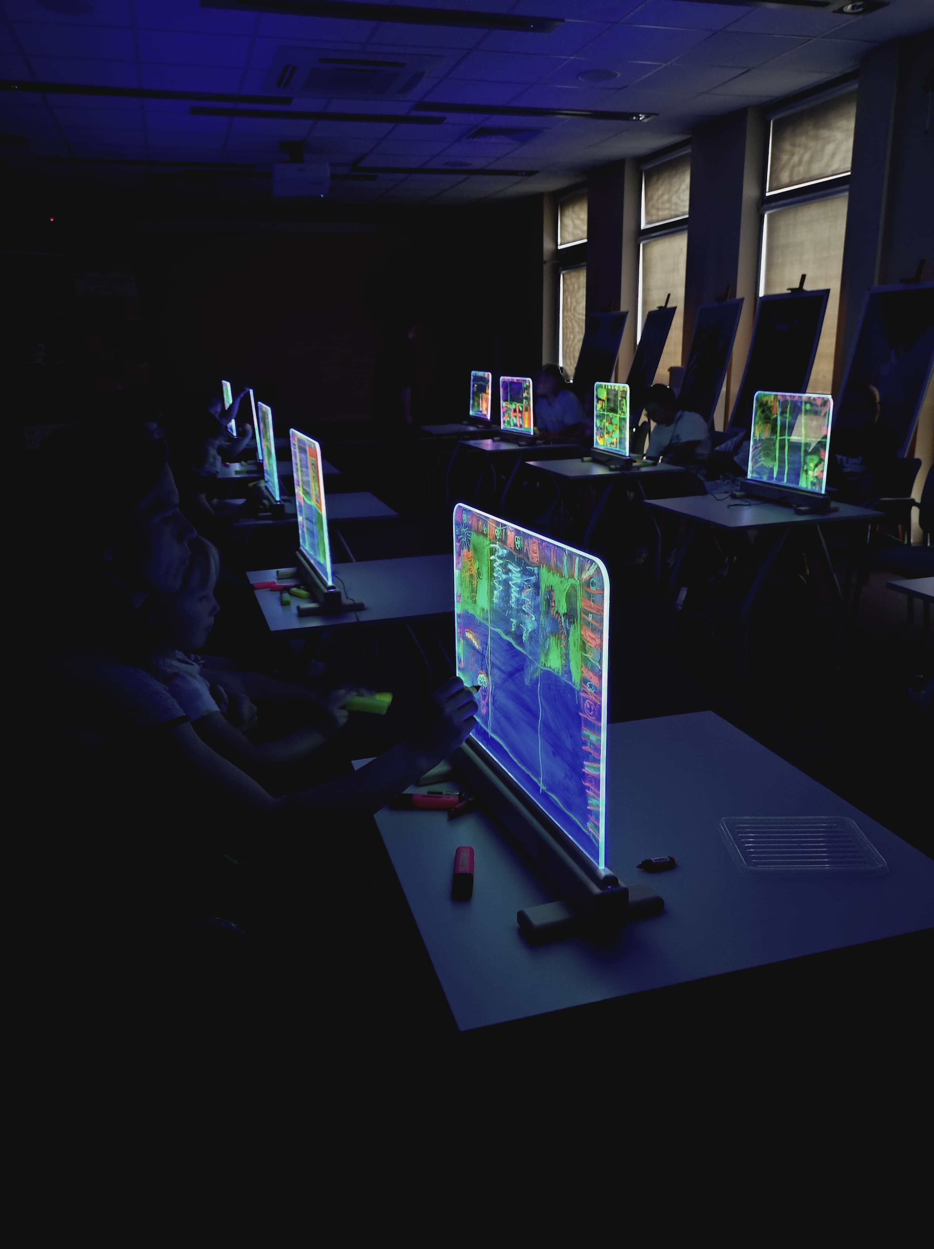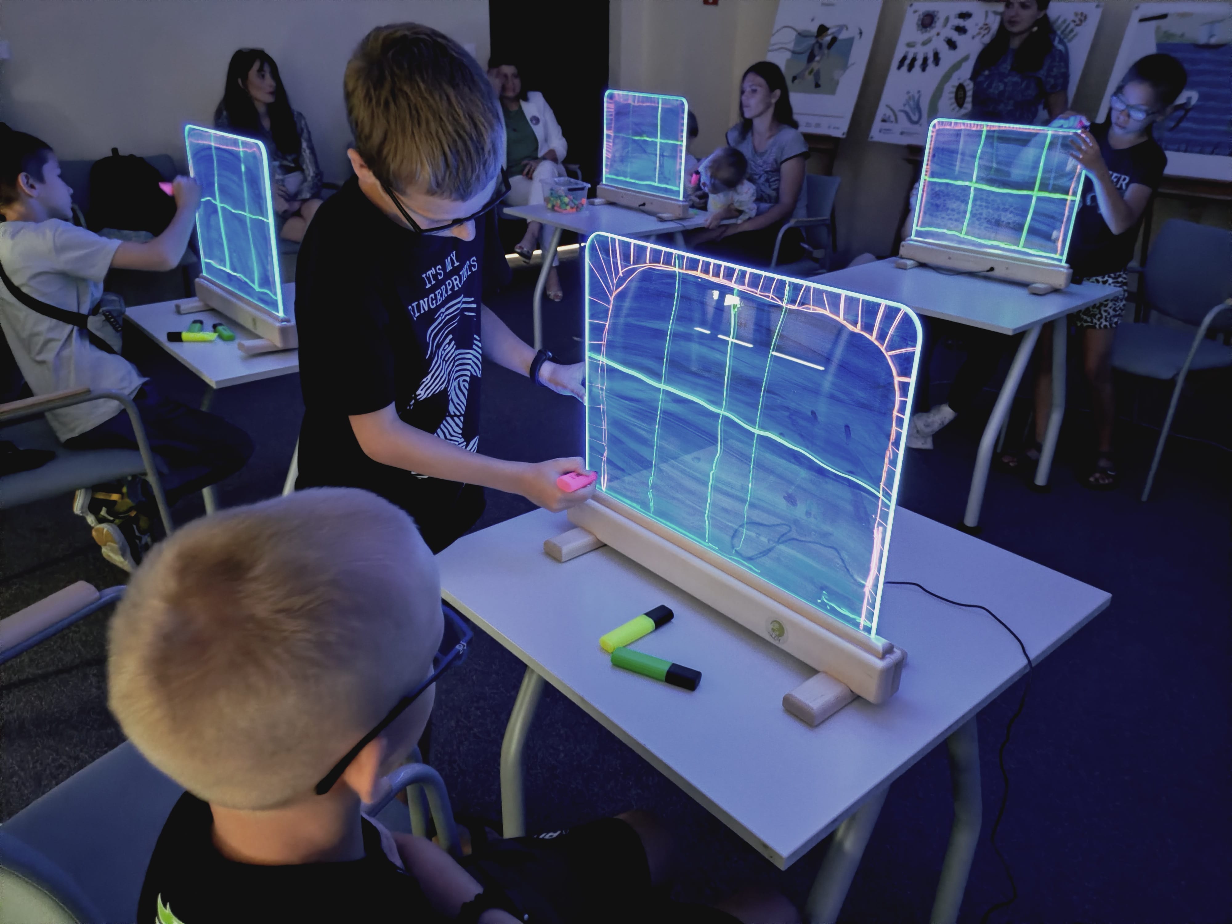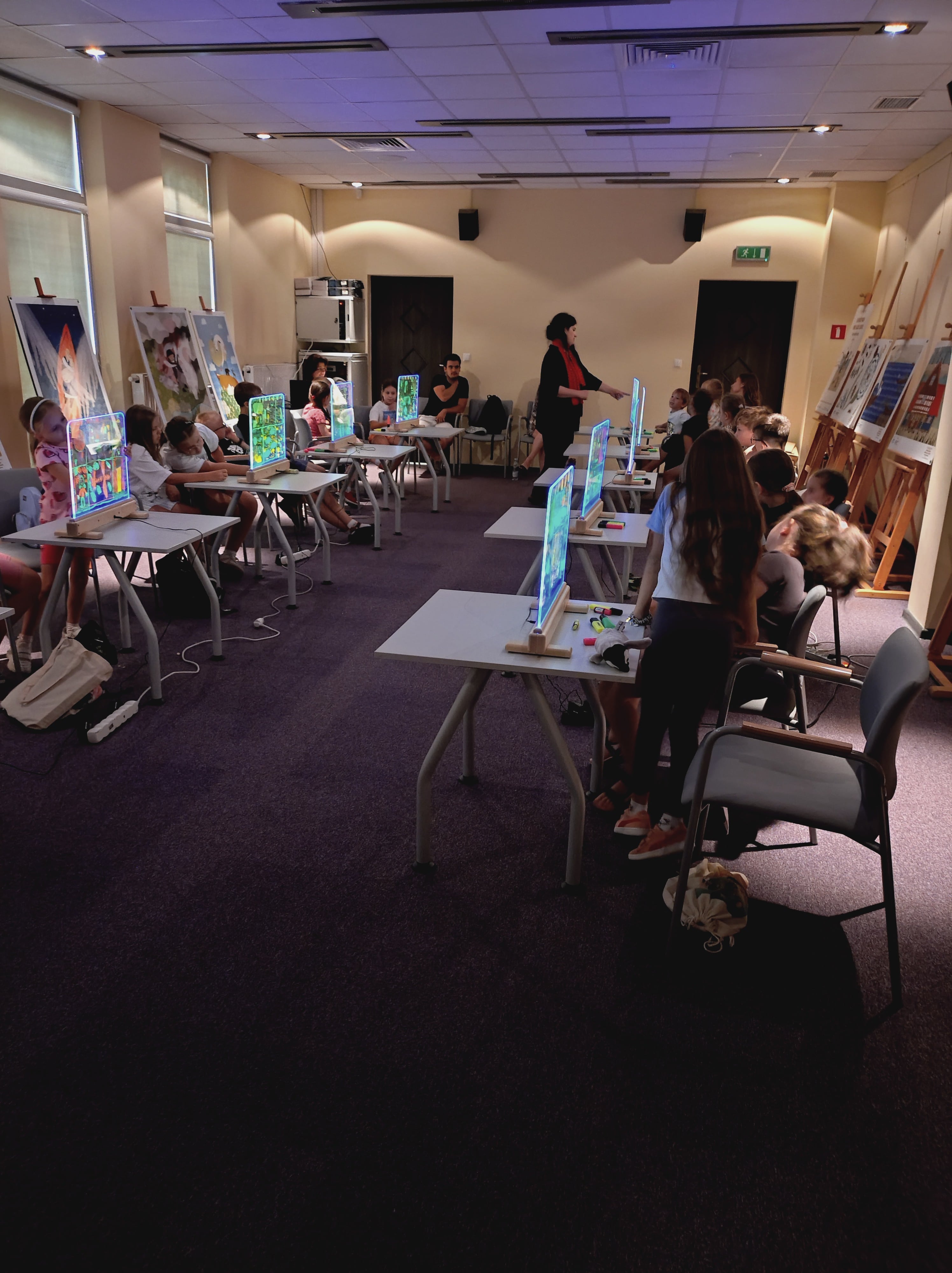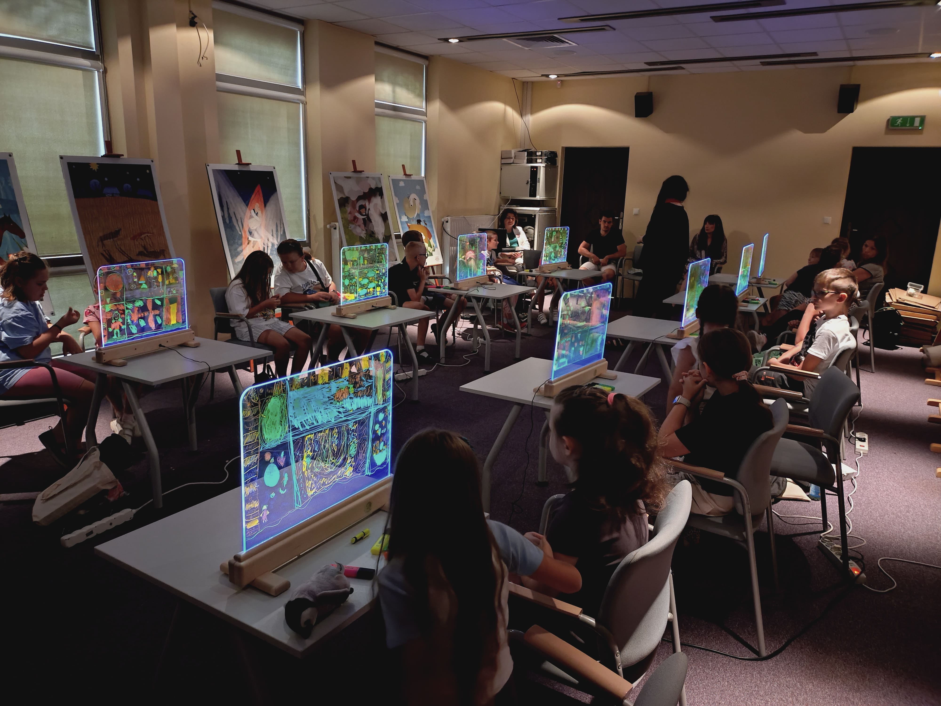 Podczas warsztatów przy zgaszonym świetle w zupełnej ciemności, jedynie przy blasku podświetlanych sztalug, dzieci tworzyły obrazy pełne energii żywiołów : ognia, wody i wiatru. Każdy rysunek wykonany kolorowymi pisakami był inny, każdy przedstawiał własną opowieść, a całość stworzyła niezwykłą galerię wyobraźni.