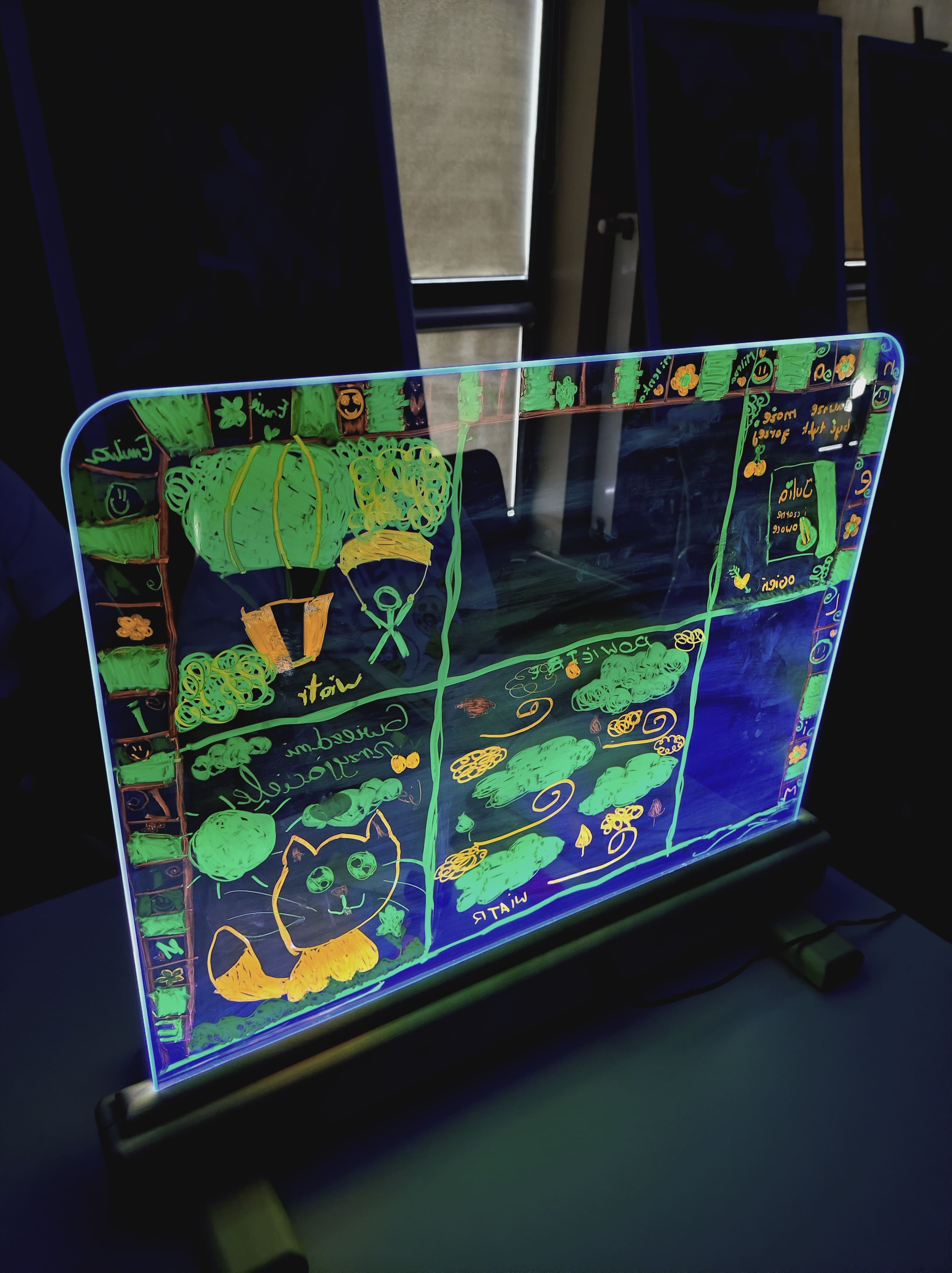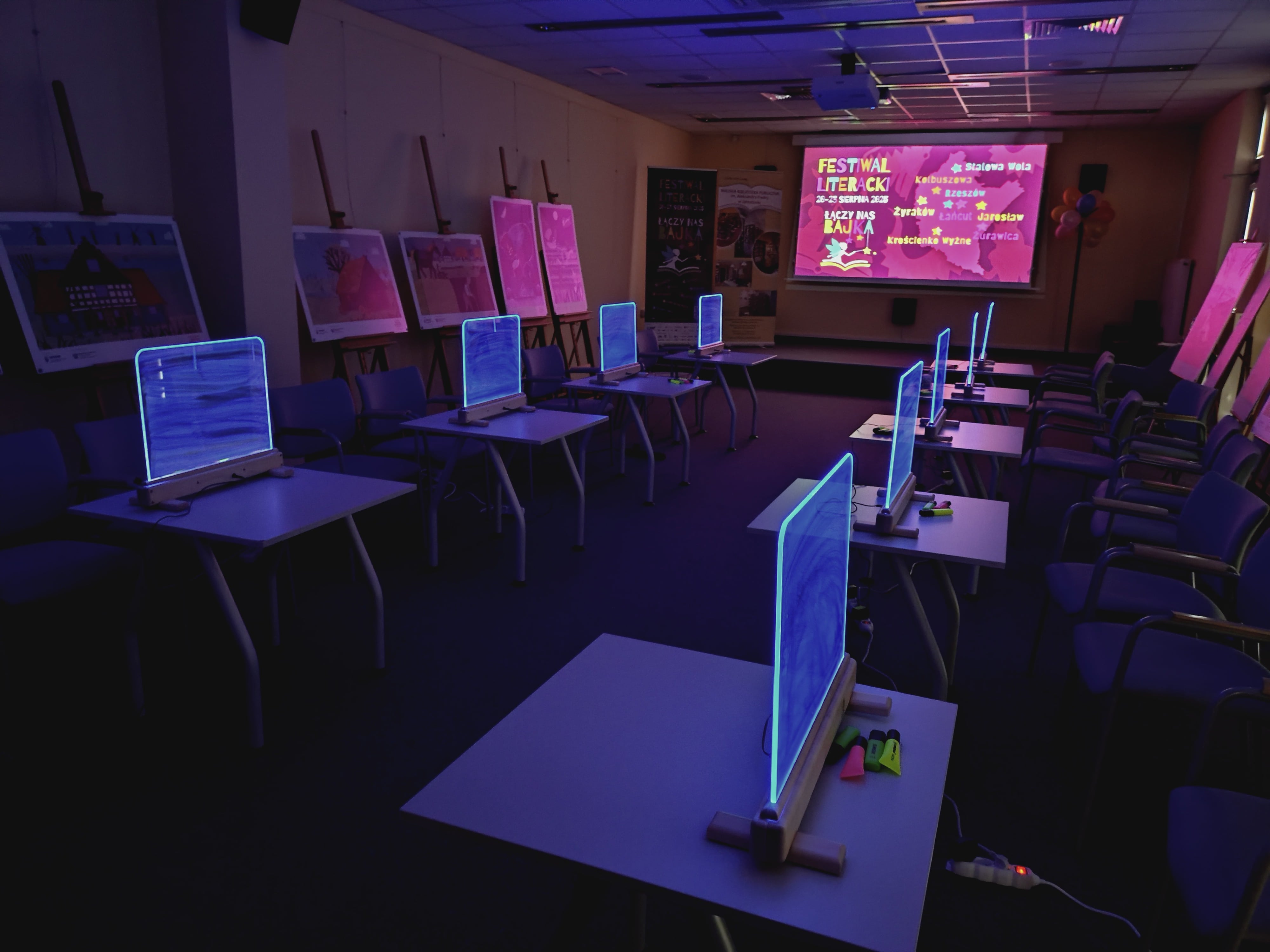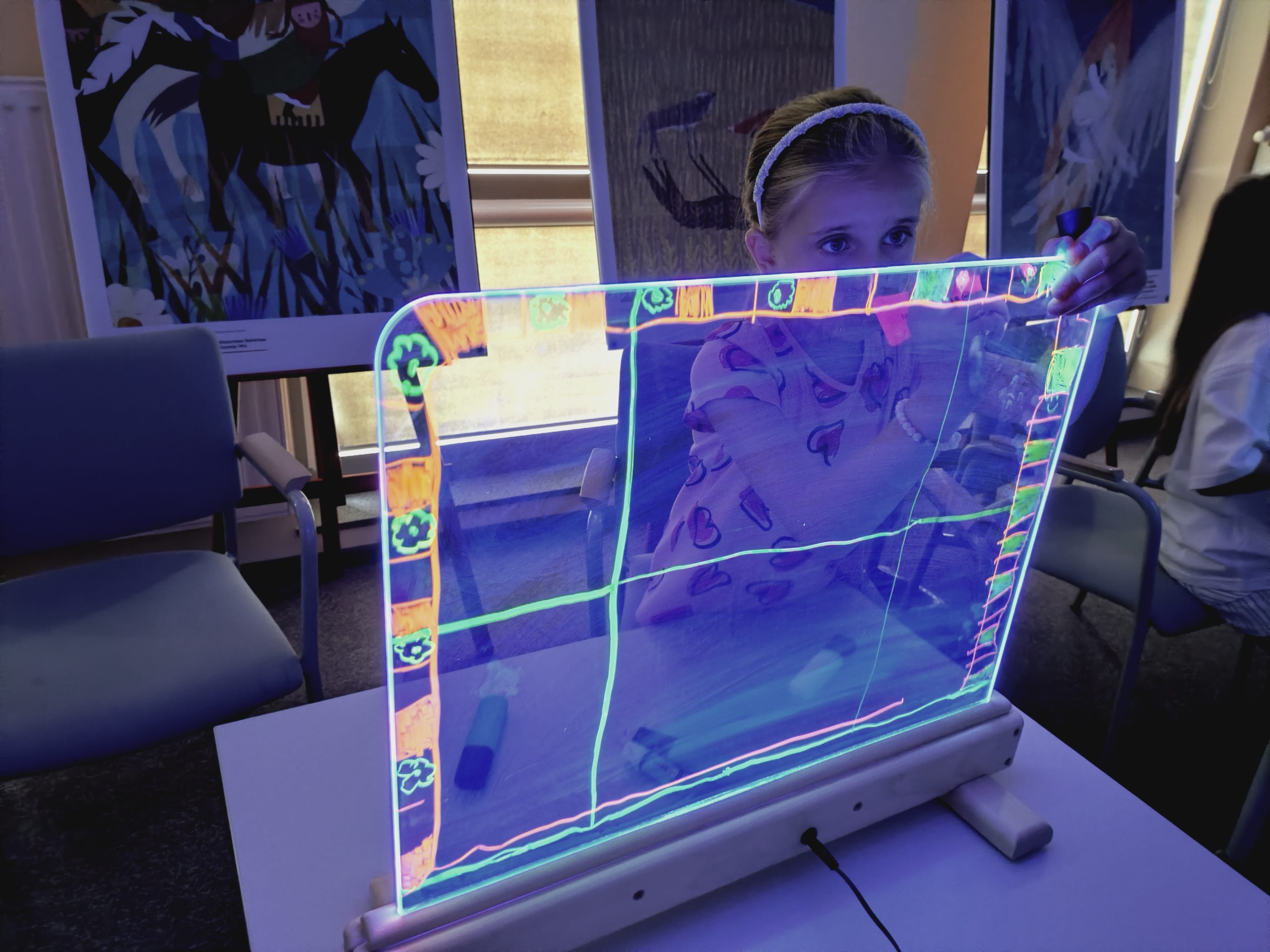 Podczas warsztatów przy zgaszonym świetle w zupełnej ciemności, jedynie przy blasku podświetlanych sztalug, dzieci tworzyły obrazy pełne energii żywiołów : ognia, wody i wiatru. Każdy rysunek wykonany kolorowymi pisakami był inny, każdy przedstawiał własną opowieść, a całość stworzyła niezwykłą galerię wyobraźni.