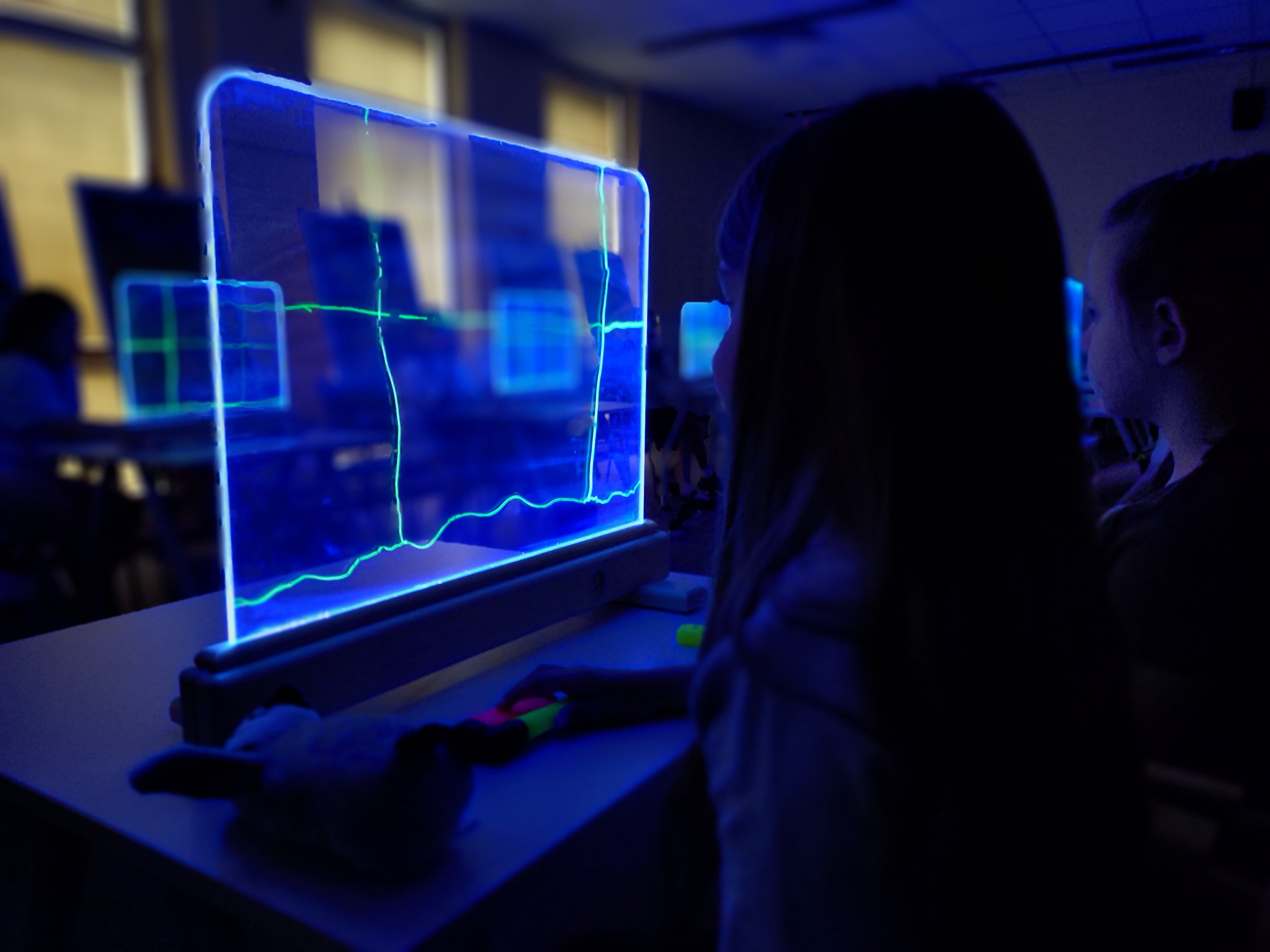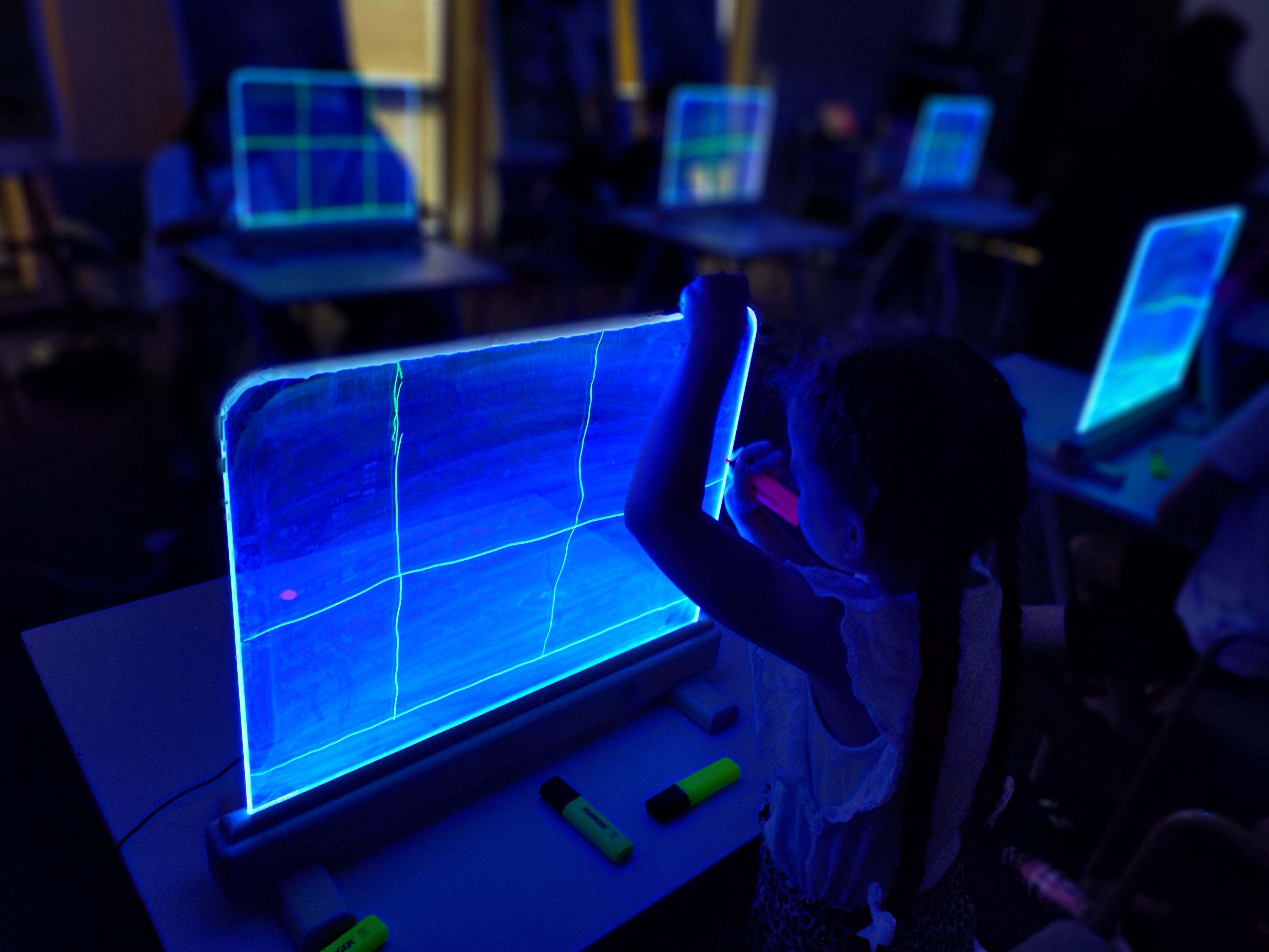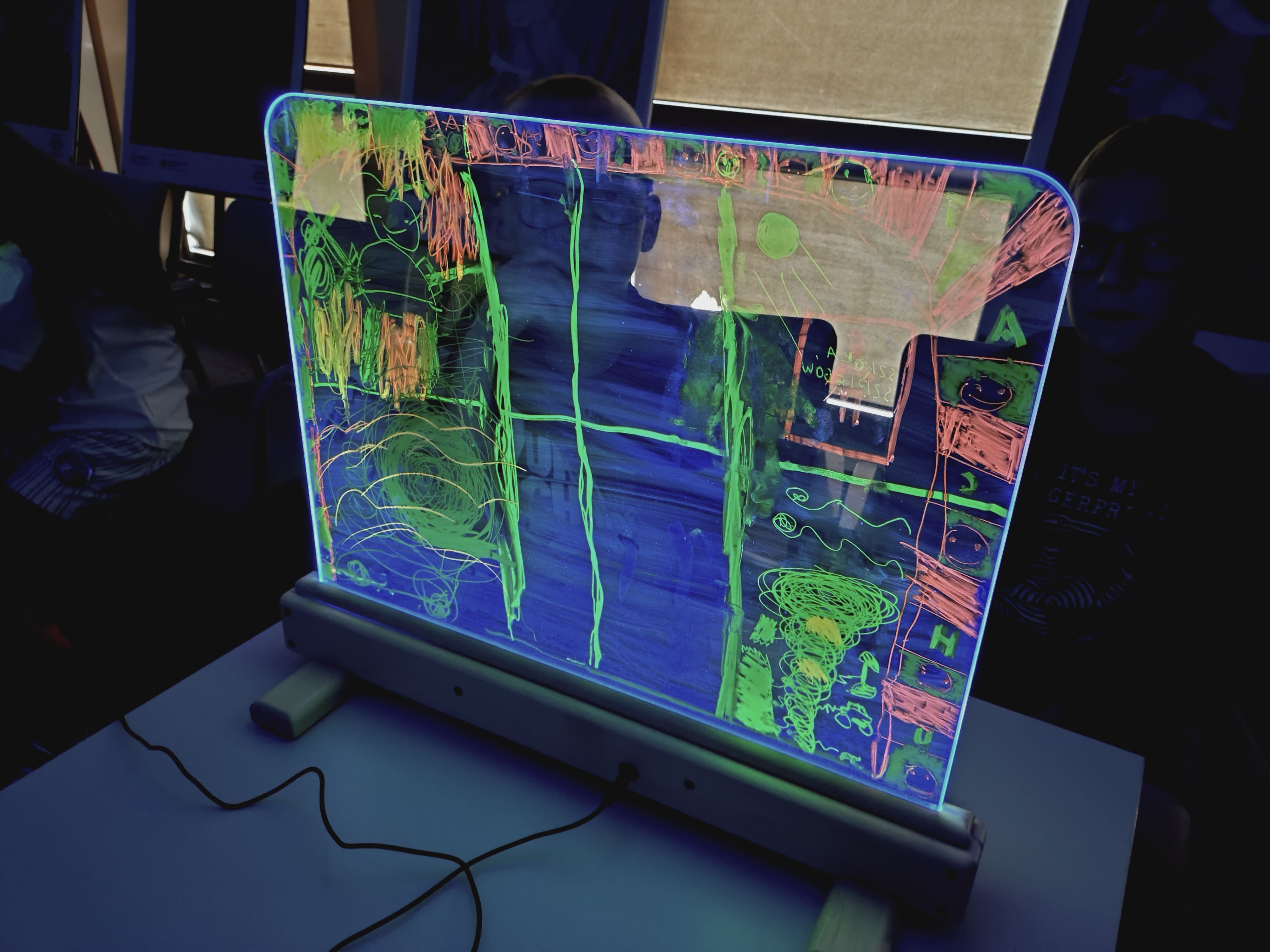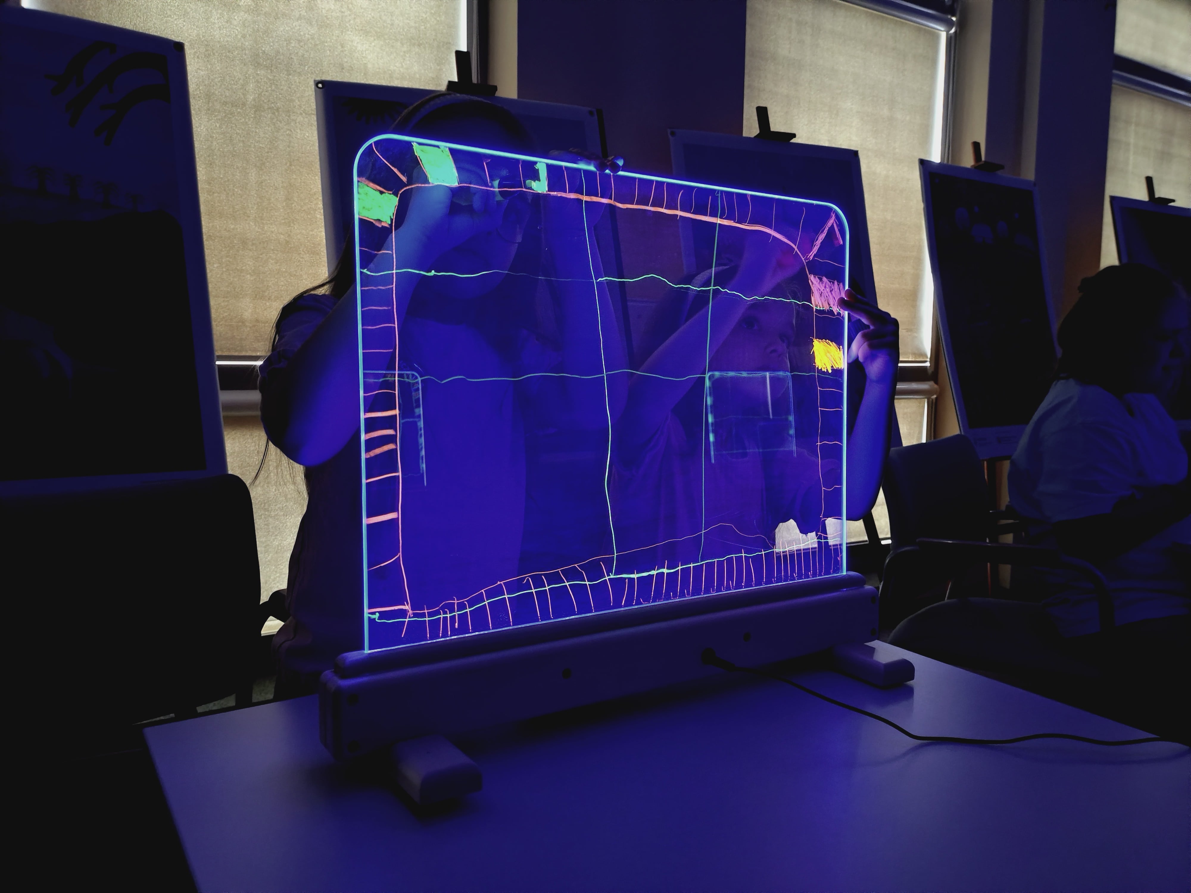 Podczas warsztatów przy zgaszonym świetle w zupełnej ciemności, jedynie przy blasku podświetlanych sztalug, dzieci tworzyły obrazy pełne energii żywiołów : ognia, wody i wiatru. Każdy rysunek wykonany kolorowymi pisakami był inny, każdy przedstawiał własną opowieść, a całość stworzyła niezwykłą galerię wyobraźni.
